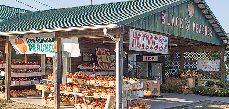 At the roadside market, fresh produce brims from open bins year-round. Tables and chairs prompt friendly conversation, and delectable baking smells perfume the place. “Probably 90% of [the produce] we sell here, we raise,” says Black. That includes peaches, strawberries, blueberries, blackberries, stake tomatoes, pumpkins, gourds, squash, beans, and round and square hay bales.